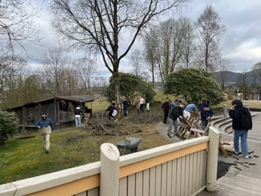 Elevene i 8. og 9. klasse gjennomfører disse ukene et uteprosjekt der de lager ved og kutter/maler grener til spon – skolen har felt ned en del trær på eiendommen som en forberedelse til fremtidige byggeplaner. En del av trevirket brukes også som sløydmaterialer. Etter ferdig arbeid, der de har fått brukt kroppen og bl.a. lært om bruken av verktøy, går de til klassene og arbeider med verdensreligionene i 8. og historie i 9. En fin start på skoledagen!