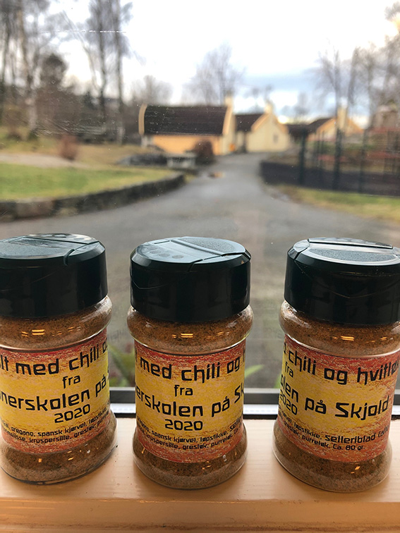 urtesalt m chili bosse Published 4. desember 2020 på 567 × 756 Urtesalt med chili og hvitløk – bøsse. Innhold: havsalt, skvallerkål, grønnkå, oregano, spansk kjørvel, løpstikke, selleriblad (allergen), sitronmelisse, kruspersille, gressløk, purreløk, chili, hvitløk.